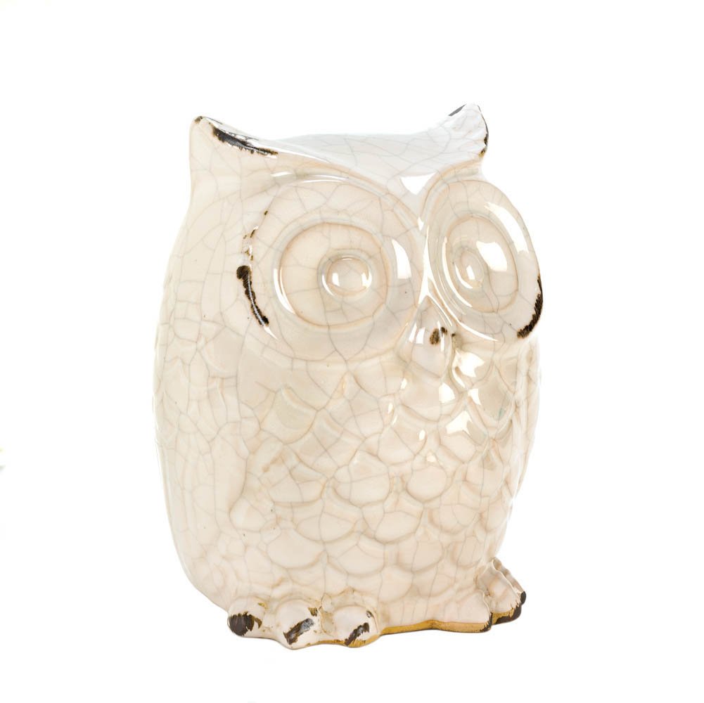 This wide-eyed owl figurine features a crackled white finish thatÆs creatively distressed in spots to look like a timeworn treasure and makes the ultimate fashionable addition to your tabletop, shelf or mantel dÚcor. Item weight: 1.4 lbs. 4 5/8" x 4 3/4" x 6 1/2" high. Ceramic. UPC: 849179016296. Decorate your tabletop, shelf or mantel with this charming white owl. His iridescent glaze is crackled and worn to perfection, making him a fashionable addition to your decor. Item weight: 1.4 lbs. 4 5/8" x 4 3/4" x 6 1/2" high. Ceramic. UPC: 849179016296.