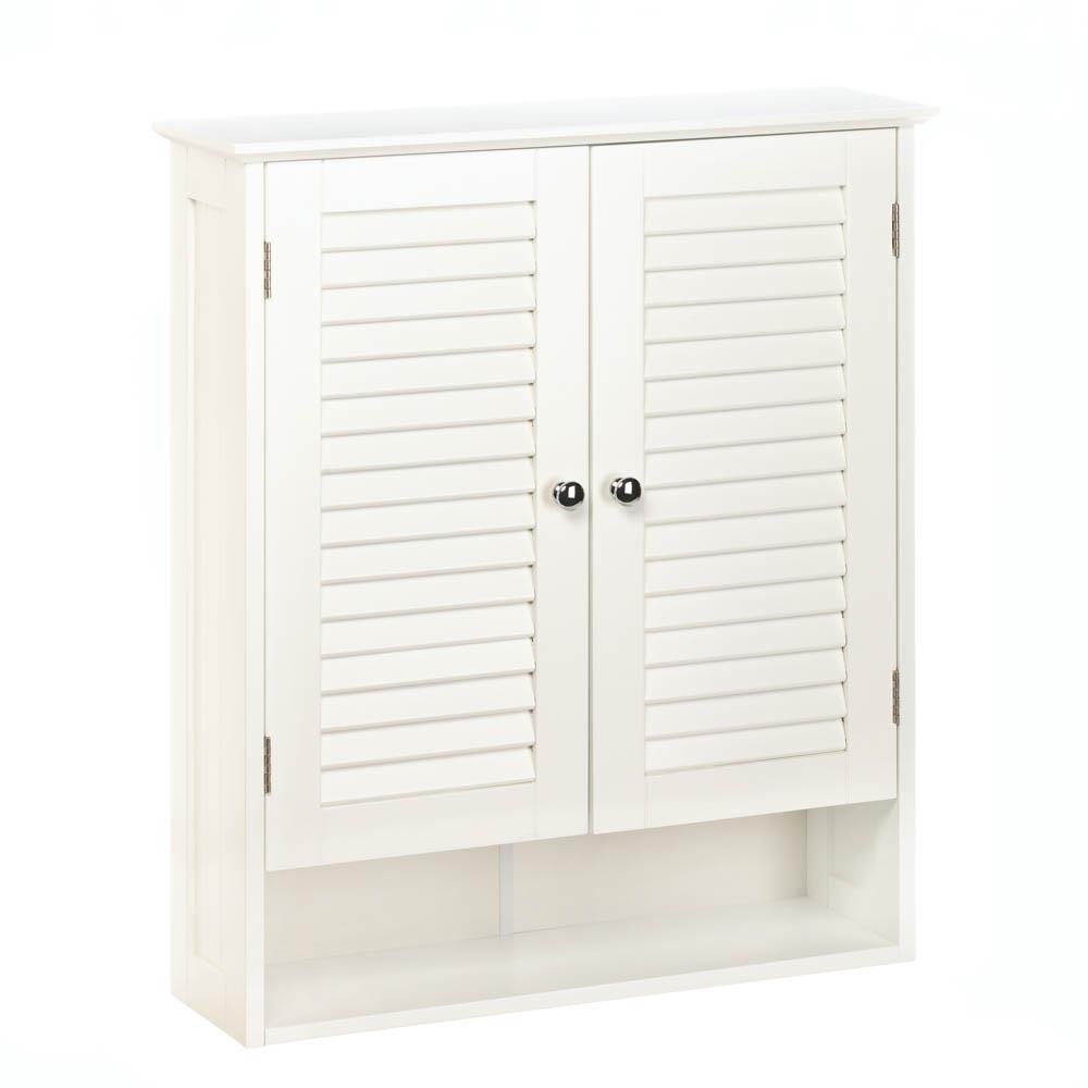 • Add storage space to any wall with this lovely wood cabinet. It features a lower display shelf and shuttered doors with silver hardware, and behind the doors are shelves to keep your essentials organized. This is a great addition to your bathroom!