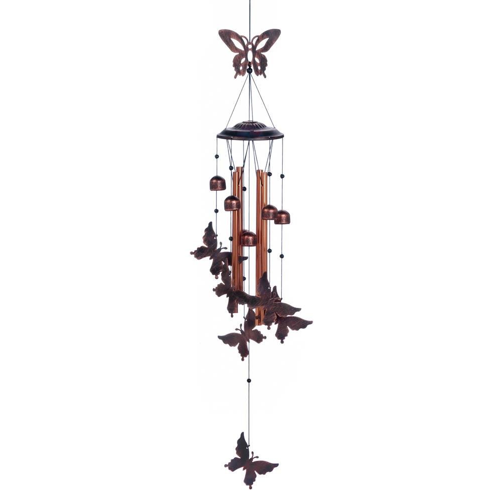 • A flock of butterflies to fill your days and evenings with sweet sound! This beautiful metal wind chime features a singular butterfly cutout on top, long chimes below along with small bells, and a group of butterflies that will twirl in the breeze.