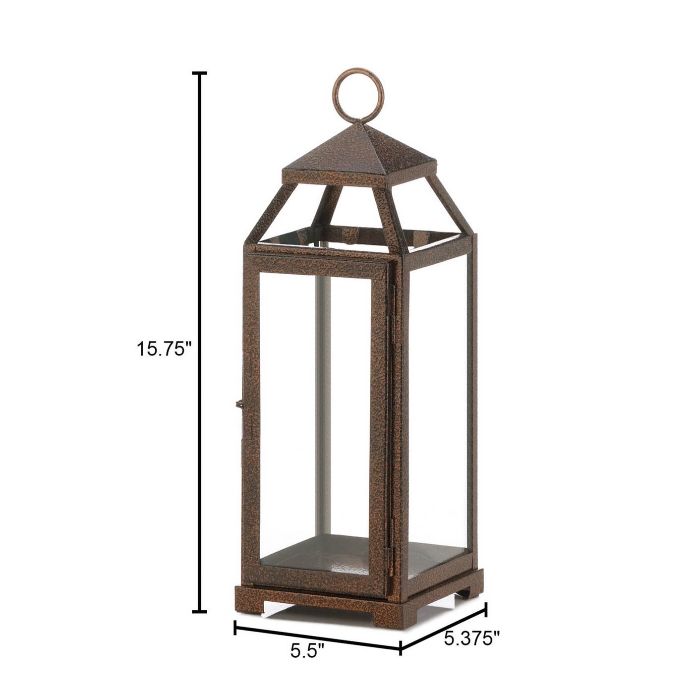 • Decorate your indoor or outdoor space with this charming copper lantern. Featuring a durable iron frame in an attractive speckled copper finish, encased with glass window panes. Display this lantern on its own with a pillar candle or pair it with other sized lanterns to create an enchanting setting.