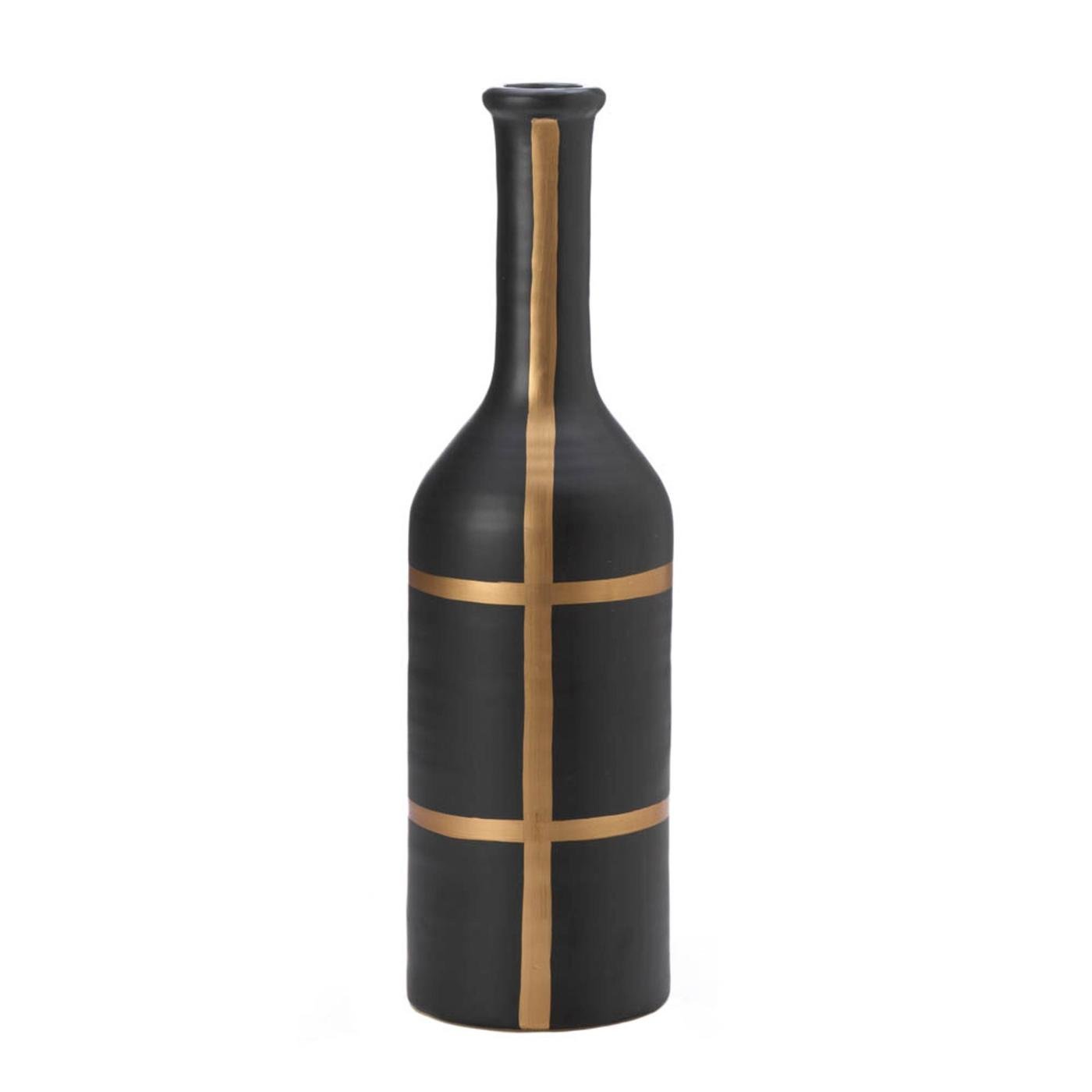 The Iberia Black and Gold Vase offers modern appeal with its striking matte black finish, gold line detailing, and narrow mouth.||Contemporary gold line detailing. Matte black finish.