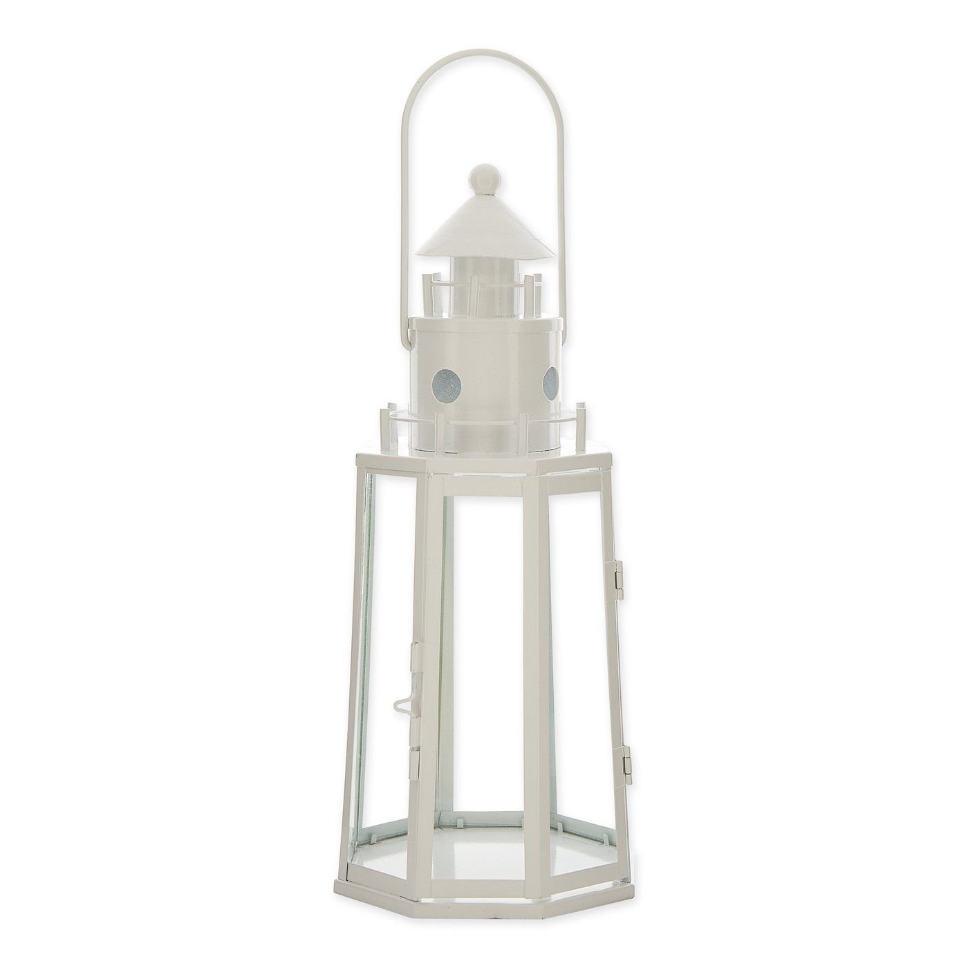 Decorate your home like a sleepy seaside village with this charming lighthouse lantern. With glass window panes, a contemporary galvanized metal top, and a metal handle for easy hanging this lantern is both sturdy and chic. Place a candle or LED of your choice inside the lantern to illuminate your space in a soft and serene glow. Use it to create a centerpiece for parties or special events, display on a countertop or coffee table, or to accent beach themed décor - available in a variety of styles and colors!