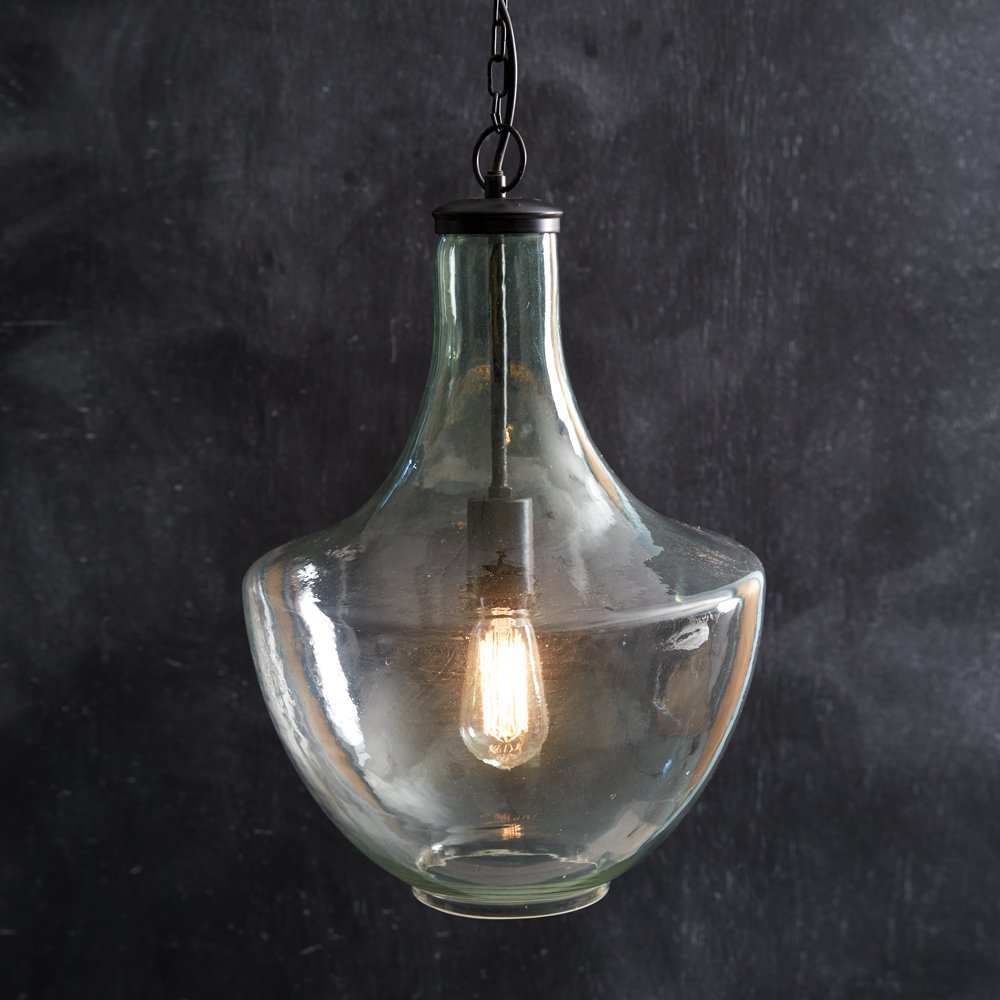 Organic and minimal by nature, this stunning pendant lamp will provide a glistening touch in a room. Item is blown by mouth and variations in glass are to be expected, which help create a beautiful one-of-a-kind piece. Pendant is fashioned from glass and metal with black accents. Includes 39'' of chain and canopy. This pendant lamp is designed to be hardwired: no plug is included. Requires a standard light bulb, not included. 40-watts is the maximum suggested bulb wattage for this item.